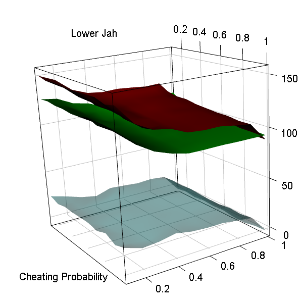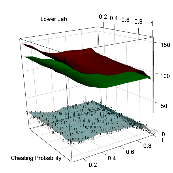Figure 1 (Thesis: Figure 4.7): Number of cheaters with relationship to non-cheater for different Upper and Lower Jah Differences