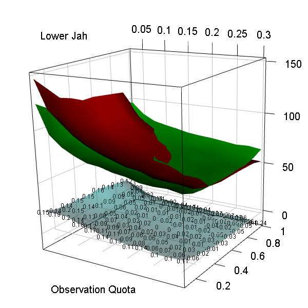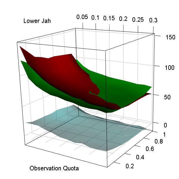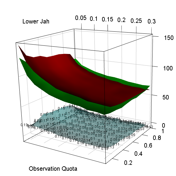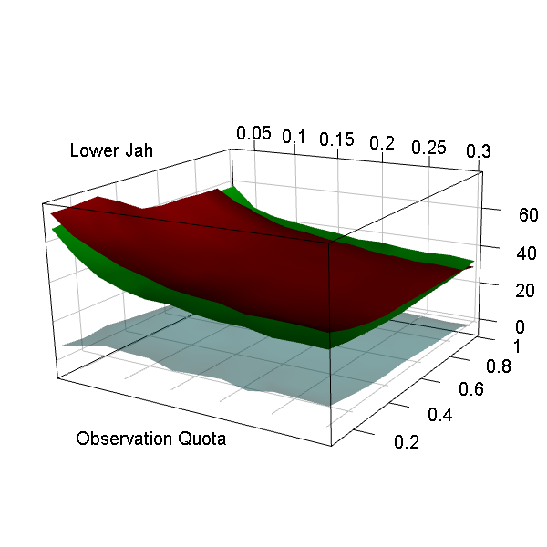 Figure 3 (Thesis: Figure 4.9): Number of cheaters with relationship to non-cheater for different Observation Quotas and Lower Jah Differences